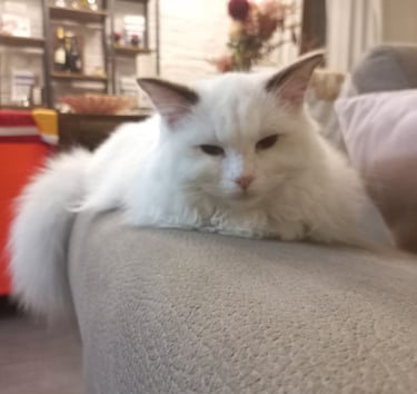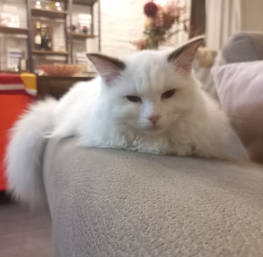 E infine Surimi, figlia di Milly e futura mamma. Bianca come un fiocco di neve e due occhi azzurri che ipnotizzano. Adora le coccole e i bambini.